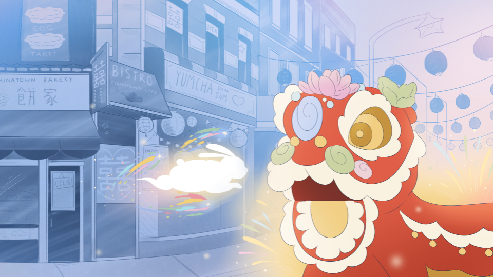 This semi-narrative animation follows a rabbit, flying through the vibrant Lunar New Year Parade. The piece shows a lively celebration scene, rich with confetti, smoke, and glowing lanterns. The scene incorporates an illustrated view of New York's Chinatown, showcasing its architecture, storefronts, and bustling streets. The work combines hand-drawn 2D animation, effects, and sound design.